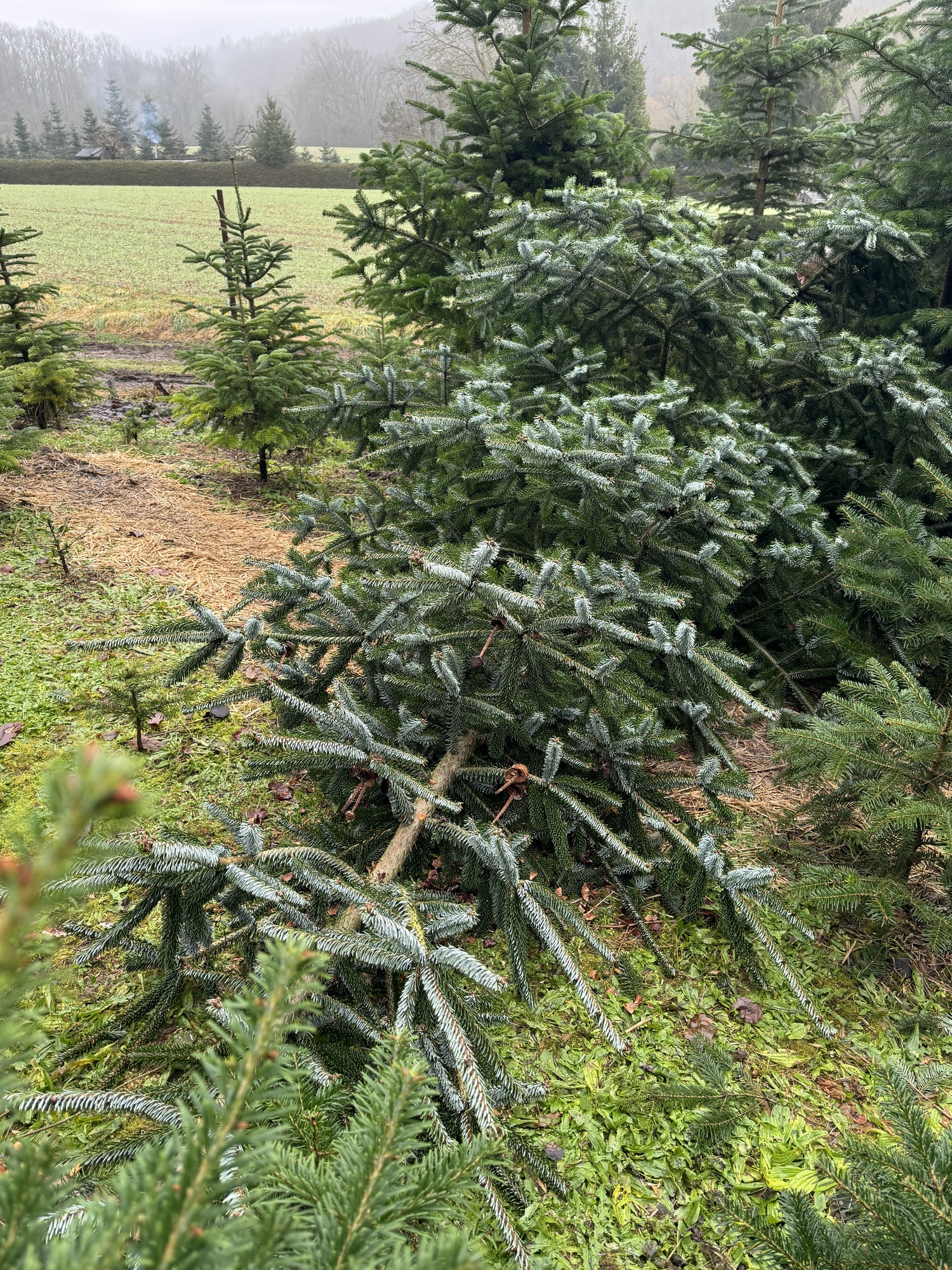 So haben wir uns auch in diesem Jahr am Samstag vor dem "letzten" Adventssonntag (eigentlich war es diesmal ja erst der 3. Advent) um 9 Uhr auf den Weg zu unserer Christbaumfamilie Hartmann in Dittelbrunn gemacht. Schon vor ein paar Wochen hatten wir unseren krossen Christbaum ausgesucht, der diesmal stattliche 7m misst. Jetzt galt es, ihn zu sägen und heim in die krosskirche zu bringen.