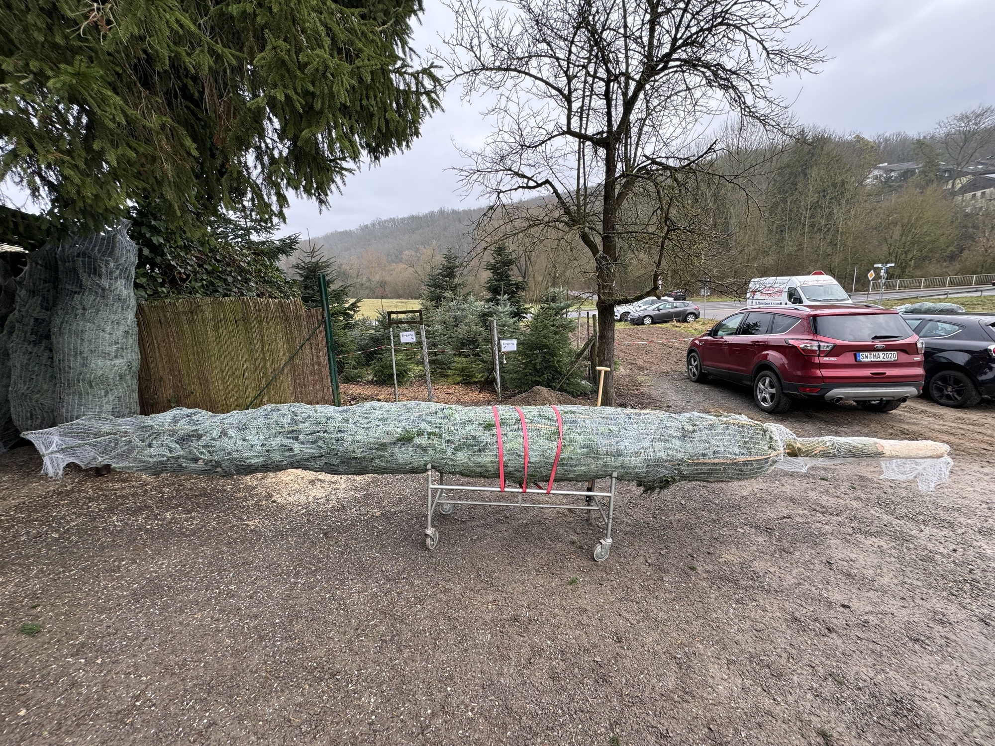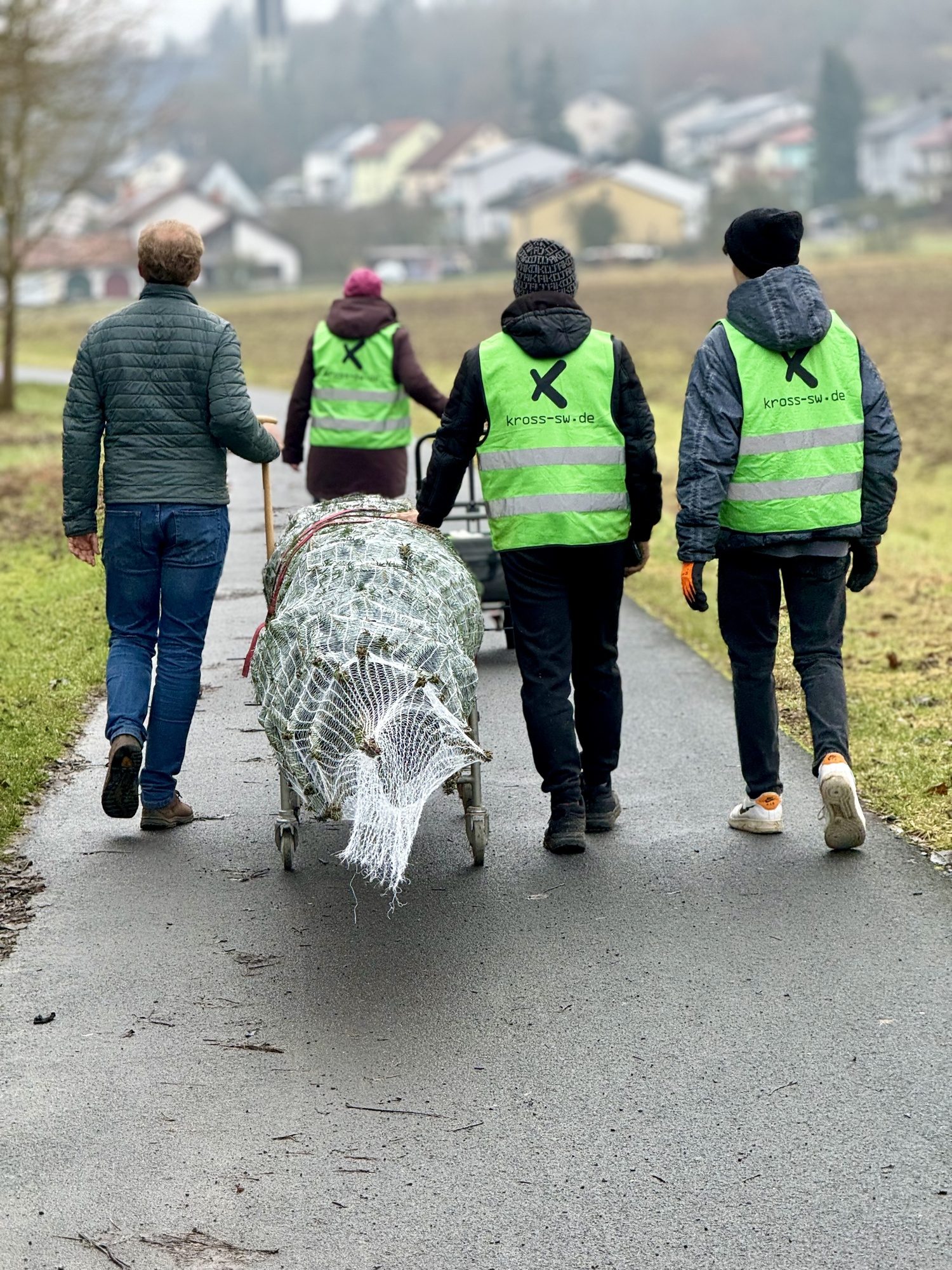 Die größte Herausforderung nach dem Fällen war, ihn für den Transport einzunetzen. Doch mit vereinten Kräften hat das geklappt. So war es dann auch ein leichtes, den Baum auf unser Wägelchen zu hieven und gemeinsam von Dittelbrunn aus durch die Stadt bis zur Kirche zu rollen. Für einen kurzweiligen Weg sorgte die Weihnachtsmusik aus der Lautsprecherbox sowie Knusperstangen und Getränke.