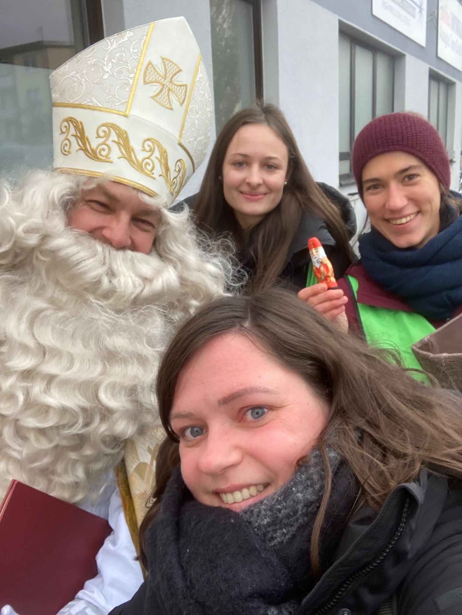 Weiter ging es dann durch die Innenstadt und wir beschenkten die Menschen, die uns auf der Straße begegneten. Zuerst war ich noch etwas zurückhaltend, denn es fällt mir normalerweise schwer, einfach fremde Menschen anzusprechen. Doch nach den ersten positiven Erfahrungen und wirklich schönen Begegnungen mit den unterschiedlichsten Menschen, viel es mir zunehmend leichter. Und die Reaktionen auf den verkleideten Bischof Nikolaus waren wirklich faszinierend. Erwachsene Menschen, die die Straßenseite wechselten, um ein paar Worte mit uns zu wechseln, Jugendliche, die unbedingt ein Selfie mit dem Nikolaus wollten, Kinder, die den Nikolaus mit großen Augen anschauten, usw. Es machte wirklich Spaß, den Menschen mit einer Kleinigkeit so eine große Freude zu bereiten und Postbot*innen, Busfahrer*innen, Marktverkäufer*innen, Mitarbeitenden der Straßenreinigung usw. unseren Dank und unsere Wertschätzung auszudrücken.