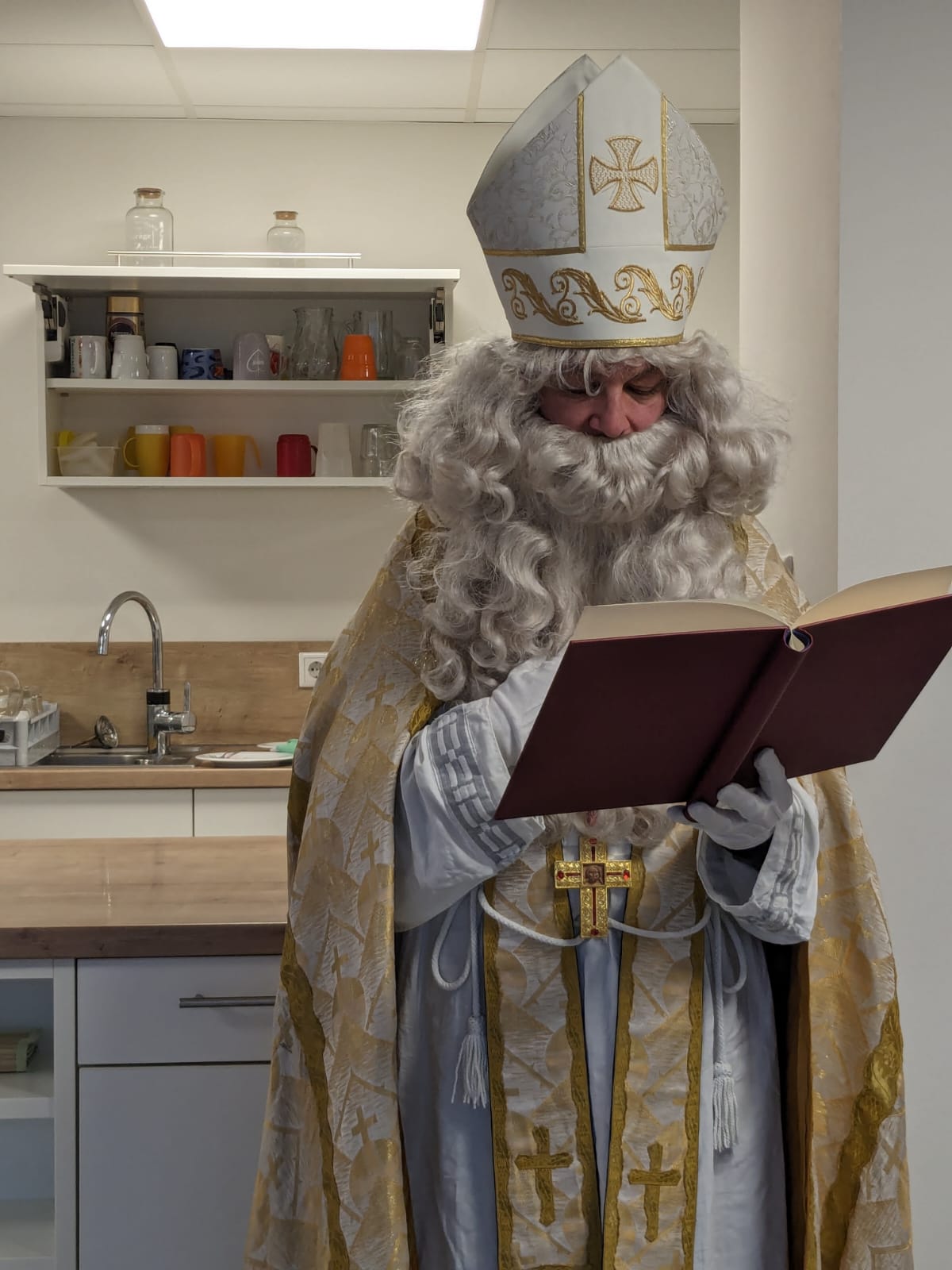 Doch mit der Zeit wurde es dann doch ziemlich kühl und wir freuten uns über eine kleine Pause, bevor es weiter zur nächsten Station ins kom,ma, dem offenen Jugendtreff der kja ging. Dort hatten die Hauptberuflichen Mitarbeitenden und die Teamer*innen für jedes Kind der Hausaufgabenbetreuung einen kleinen Text verfasst, den unser Nikolaus vortragen und zusammen mit einem Schoko-Nikolaus überreichen durfte.