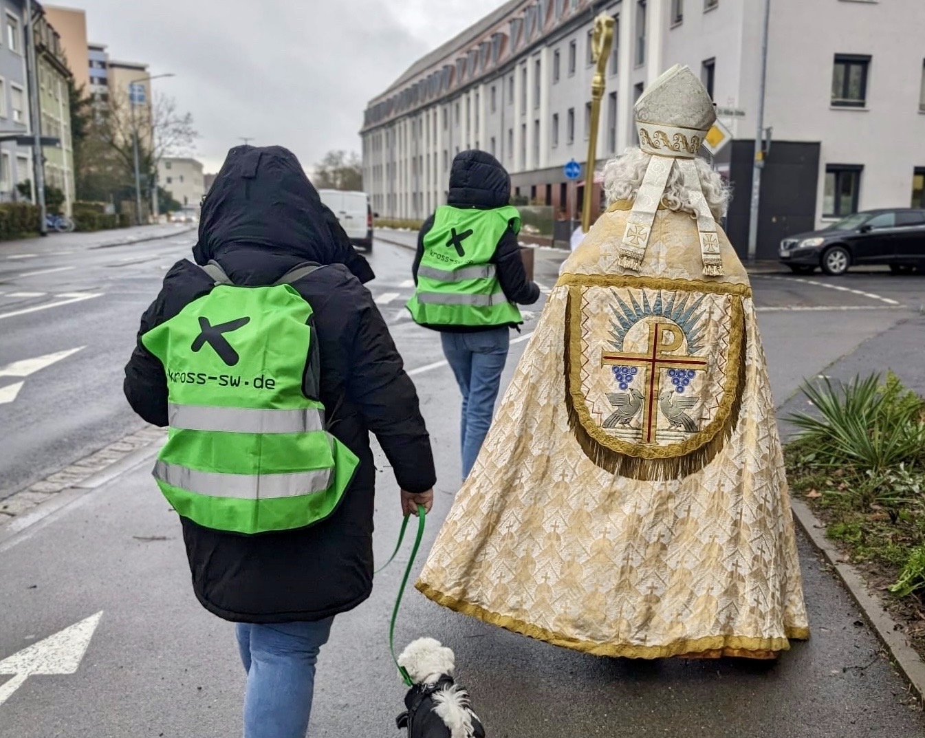 Und so war es auch für uns bei kross nicht einfach nur irgendein Mittwoch, sondern ein ganz besonderer Tag. Nach dem Vorbild vom Nikolaus hatten wir es uns zur Aufgabe gemacht, den Menschen in der Stadt Schweinfurt an diesem Tag besonders würdevoll zu begegnen, die zu besuchen, die sonst häufig nicht in unserem Blickfeld sind, und mit vielen kleinen Schokonikoläusen im Gepäck bzw. auf dem Arm klein und groß, alt und jung eine kleine Freude zu machen.