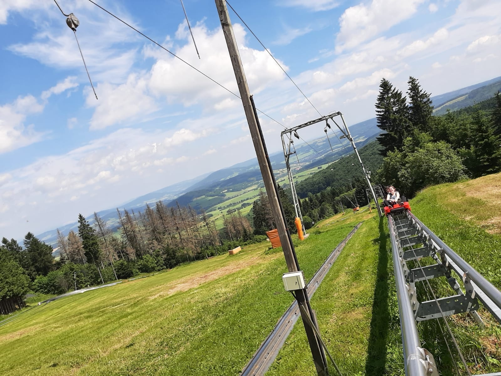 Um 10 Uhr trafen wir uns vor Maria Hilf. Von dort aus fuhren wir zu siebt, aufgeteilt auf zwei Autos, in die Rhön. An der Wasserkuppe angekommen, packten bereits die ersten ihre Brotzeit aus. Anschließend holte sich jede*r eine 6er-Karte zum Rodeln, mit der man verschiedene Sachen fahren konnte. Zuerst ging es in die Doppel-Sommerrodelbahn, in der man sich zu zweit ein Wettrennen liefern konnte. Danach testeten wir den Rhönbob mit einer Maximalgeschwindigkeit von 40 km/h und fuhren im Hexenbesen, einer Sommerrodelbahn, in der Luft. Des Weiteren fuhren wir mit dem Luna-Loop. Dabei saß man in einer Kugel, in der man selber entscheiden konnte, wie viele Überschlage man machen möchte und ob diese vorwärts oder rückwärts sein sollen.